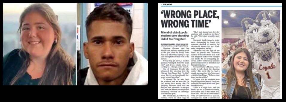 Above: Chicago Sun Times echoes alderman with “Wrong place, Wrong time” headline, adding Sheridan’s friend said the murder “didn’t feel targeted.”